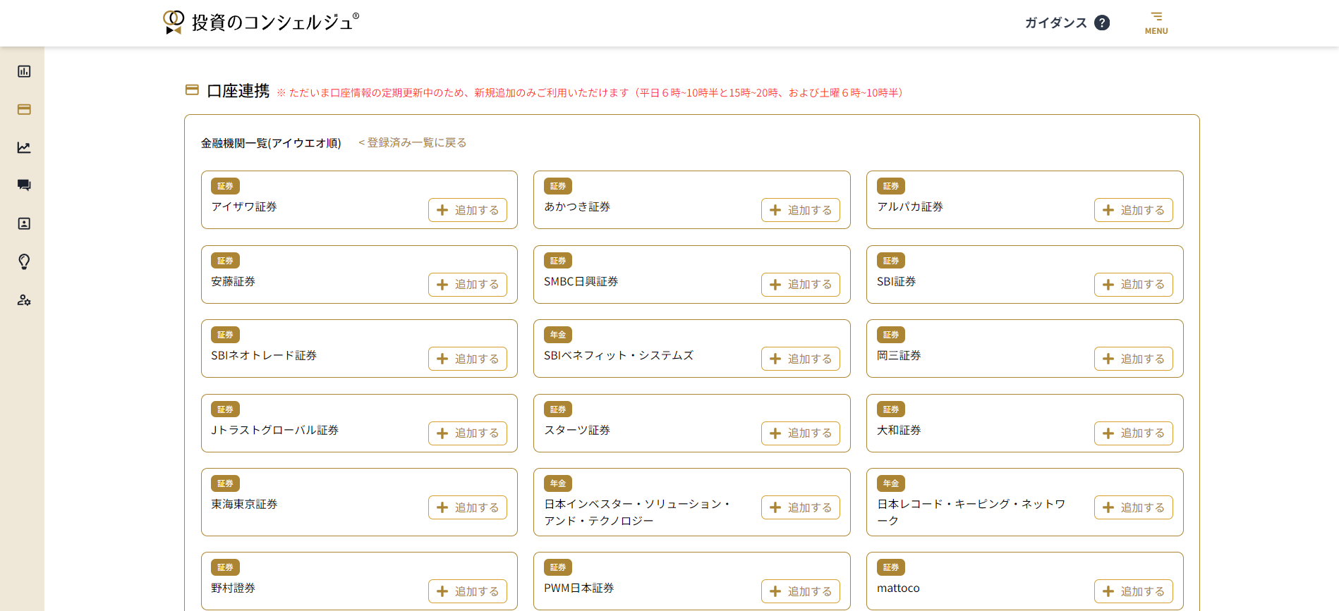 | 資産情報取得ロジック構築中 | 新規連携開始直後の証券会社のため、取得準備中です。 | 最大2〜3営業日後に、更新ボタンを再度クリックしてください。 |