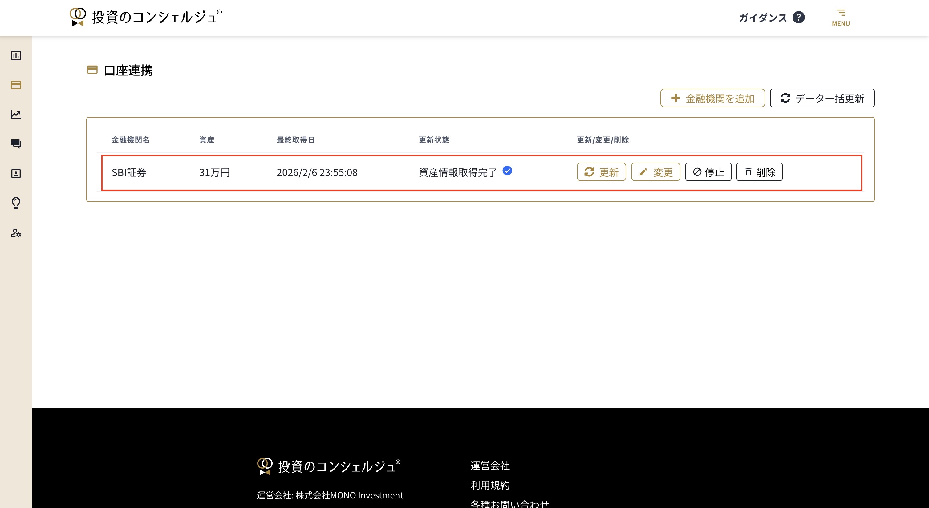 資産情報の取得が完了したら、口座連携画面へ遷移しますので更新状態が「資産情報取得完了」になっていることをご確認ください。