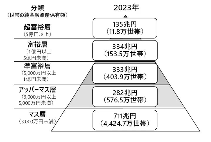 野村総合研究所は、各種統計等から2023年の日本における「純金融資産保有額」(金融資産-負債)で世帯を5階層に分類し、世帯数と資産規模を推計しました。最新の資料によると、準富裕層以上の資産は上昇傾向です。
